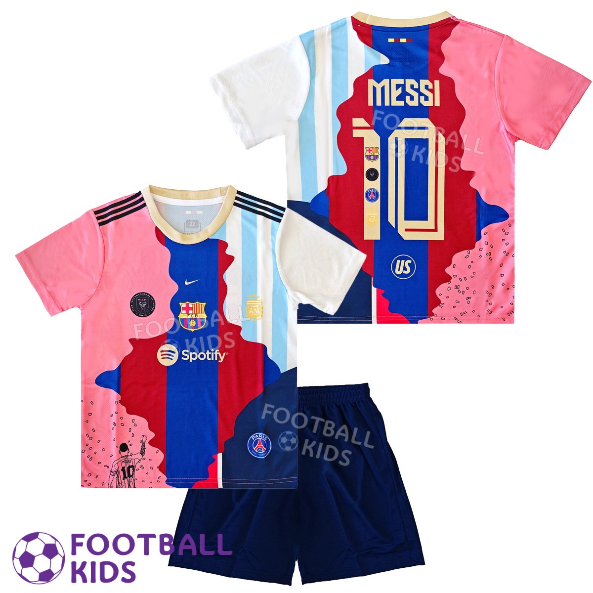 Дитяча футбольна форма Ліонеля Мессі Commemorative Edition вирізняється оригінальним колажним дизайном, що включає елементи різних знакових форм Мессі та символіку клубів і збірних, за які він виступав. На передній частині футболки розміщені логотипи Барселони, Nike та спонсора Spotify, а також стилізоване зображення Мессі з номером 10. На спині нанесено прізвище MESSI та номер 10. Кольорова гама поєднує традиційні кольори Барселони з іншими символічними відтінками. Тканина з технологією Dri-FIT забезпечує відмінну вентиляцію та комфорт під час гри.