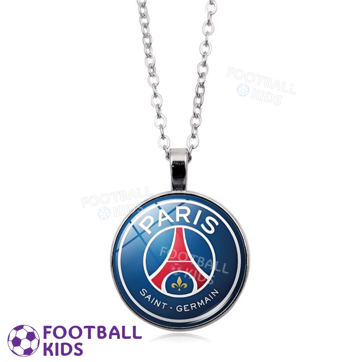 Ця стильна підвіска присвячена французькому гранду — футбольному клубу Парі Сен-Жермен. На круглому медальйоні яскраво зображена сучасна емблема клубу: біла Ейфелева вежа та геральдична лілія на глибокому синьо-червоному тлі. Емалеве покриття робить кольори насиченими та стійкими до зносу. Підвіска та ланцюжок виконані в класичному сріблястому (металевому) відтінку. Це ідеальний аксесуар, що поєднує футбольну пристрасть і паризький шик. Підвіска комплектується міцним ланцюжком.