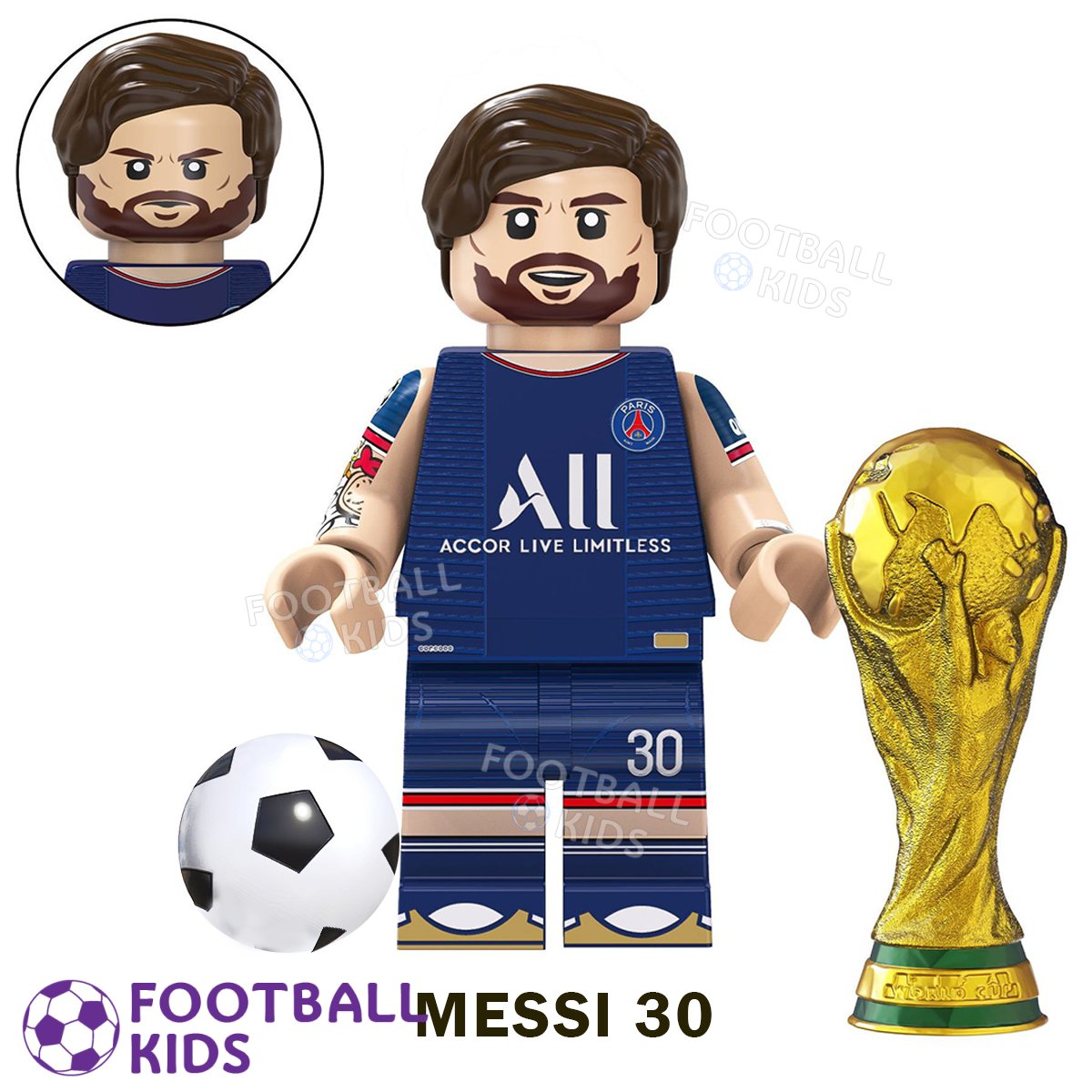Представляємо колекційну мініфігурку Lego MESSI 30 ПСЖ (Парі Сен-Жермен), присвячену аргентинському генію Ліонелю Мессі (Lionel Messi). Фігурка відтворює гравця у фірмовій темно-синій формі клубу ПСЖ. Цей набір ідеально передає його роль у команді під культовим номером 30, що ознаменував новий етап його легендарної кар'єри.
